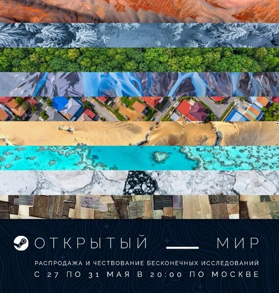 Это многодневное событие посвящено играм с популярной механикой открытого мира. На распродаже представлены многие поджанры и стили игр открытого мира, а также прямые трансляции участвующих игр из Steam. Распродажа завершится 31 мая в 20:00 по Москве. https://store.steampowered.com/sale/open_world P.S. также стартовал музыкальный фестиваль Safe & Sound организатором которого выступает Bedtime Digital Games. Фестиваль будет сопровождаться распродажей более 50 игр, концертами в режиме онлайн, выставкой и другими мероприятиями. Музыкальный фестиваль завершится 31 мая в 12:00 по Москве.