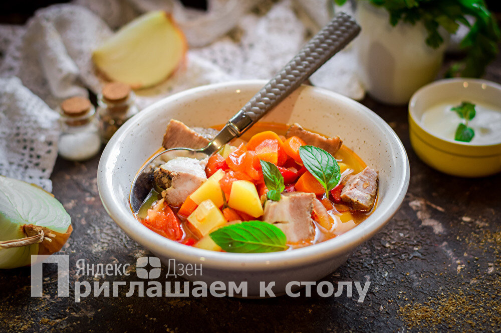 Соседка по даче угостила меня однажды вкусным наваристым супом с запахом дымка. Казалось, что она готовила его на костре, настолько соблазнительным был аромат. Я не удержалась и попросила рецепт. Оказалось, что суп она сварила из шашлыка, который остался после пикника. Конечно, хлопот с этим блюдом больше, чем с простым супом (нужен шашлык, испеченный на мангале), но результат того стоит. И когда мы собираемся на пикник, я всегда прошу взять мяса с запасом, потому что на следующий день планирую сварить любимый суп. Для приготовления первого блюда из шашлыка нам понадобятся: Все овощи надо вымыть, высушить и почистить. Лук нарезаем средними кубиками, морковь — кружочками. Из сладкого перца удаляем семенную коробочку и нарезаем его. Помидоры надо очистить от шкурки. Это легче сделать, если предварительно их обдать крутым кипятком, после этого нарезаем на кусочки среднего размера. Картофель очистить, порезать кубиками и ополоснуть в нескольких водах, чтобы смыть лишний крахмал. Затем кл