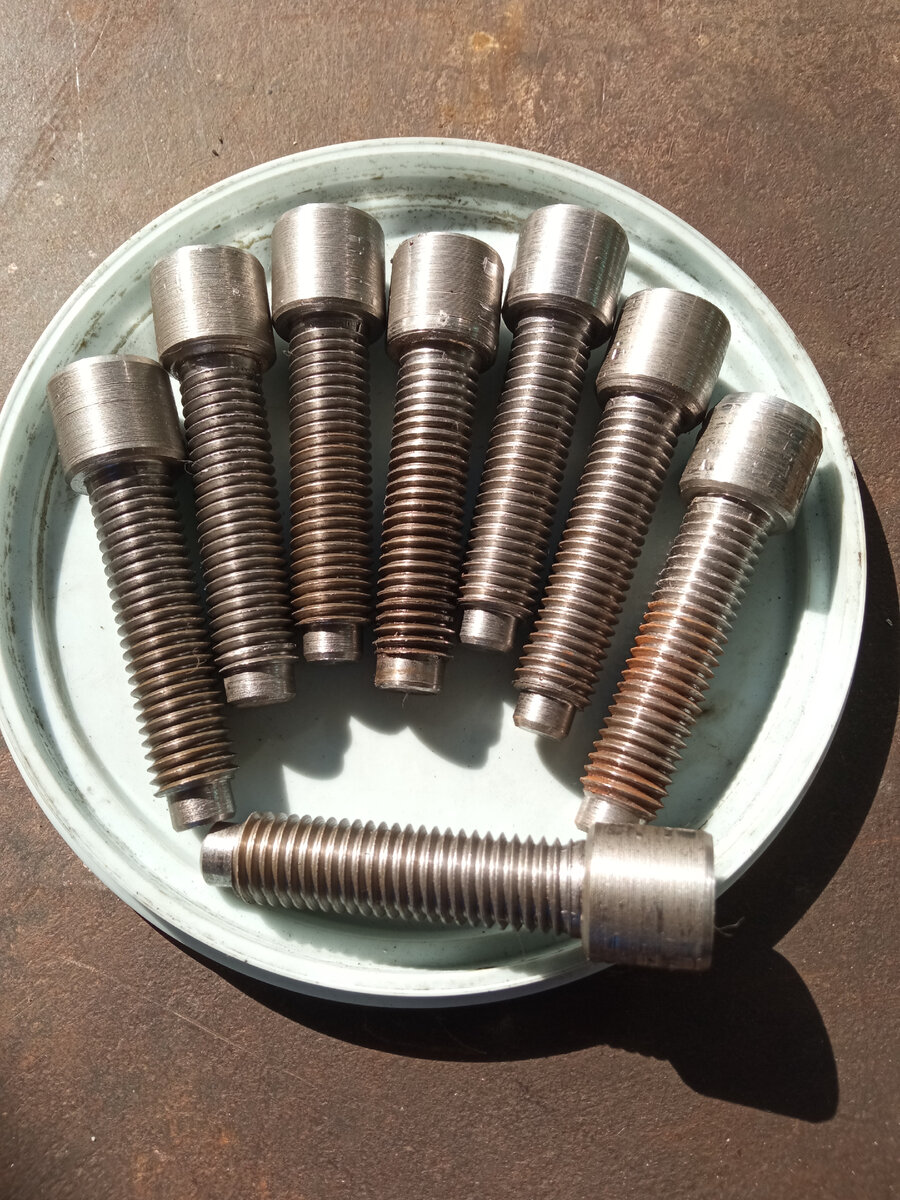 Пришло время заняться болтами для резцедержки. Так как станок у меня был не комплектный, резцедержку я покупал отдельно. На ней были болты с потянутой резьбой и из 8-ми болтов реанимировал только 1. Естественно это никуда не годилось. Поэтому на металлоприемке был приобретен прут шестигранника и приступил к работе. Размеры болтов выбрал в соответствии с ГОСТом 1486-84 65*М12. После прохода плашкой получаю ровную резьбу и отрезаю деталь Делаю 8 заготовок под будущие болты Перехожу к фрезеровке - делаю из круглого - квадратное. Фрезерного станка у меня нет, поэтому делаю из обрезка 13-мм металла державку для заготовки и зажимаю ее в резцедержку. Болт в державку, фрезу в патрон и в бой. Угол 90 градусов выдерживаю, совмещая угольник с резцедержкой и фрезерованной гранью. Прохожу все 8 заготовок Фреза оставляет сверху небольшую шляпку, около 0,5мм. Убираю ее на точильном станке. Затем закаляю болты в масле, разогревая до красна. И наконец резцедержка вооружена всеми болтами. Осталось убра