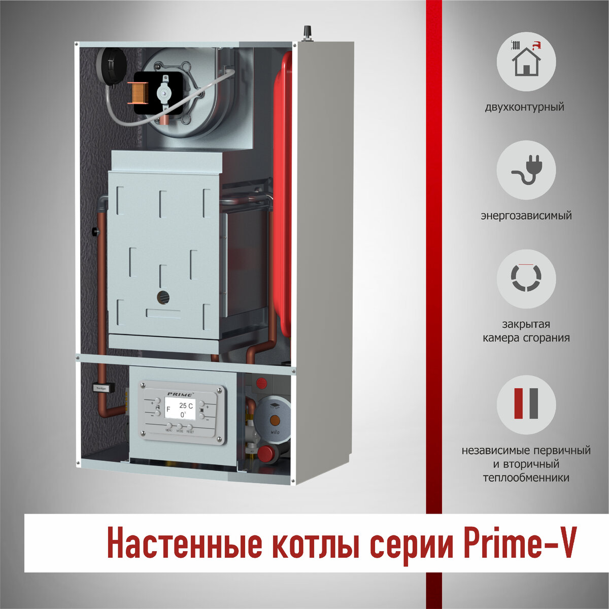 Давайте рассмотрим каждую серию настенных котлов подробнее. Настенный газовый двухконтурный котел «Лемакс» серии Prime-V обеспечивает нагрев системы отопления и системы горячего водоснабжения жилых домов, коттеджей, зданий административно-бытового назначения, оборудованных системой водяного отопления с принудительной циркуляцией теплоносителя и принудительным удалением продуктов сгорания через коаксиальный или раздельный дымоход. Разработан собственным инжиниринговым подразделением предприятия под контролем центра инновационных разработок SIT GROUP специально для эксплуатации в российских условиях. Производится исключительно из европейских комплектующих таких производителей как SIT, OTMA, WILO, POLIDORO, Valmex, NordGas, Bitron. Прошел итоговое тестирование в лабораториях POLIDORO, NordGas и SIT Идеально подходит для установки в квартирах и индивидуальных домах, не имеющих организованного дымохода. ПРЕИМУЩЕСТВА: - Коэффициент полезного действия до 92,5% - Адаптирован к перепадам давлен