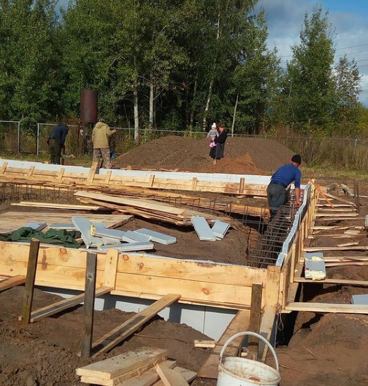 Наступил очередной день икс. Сегодня всё доделываем, завтра заливаем. Николай связывал между собой арматурные каркасы по углам дома специальным крючком. Я такой раньше не видела. Все остальные ставили опалубку.