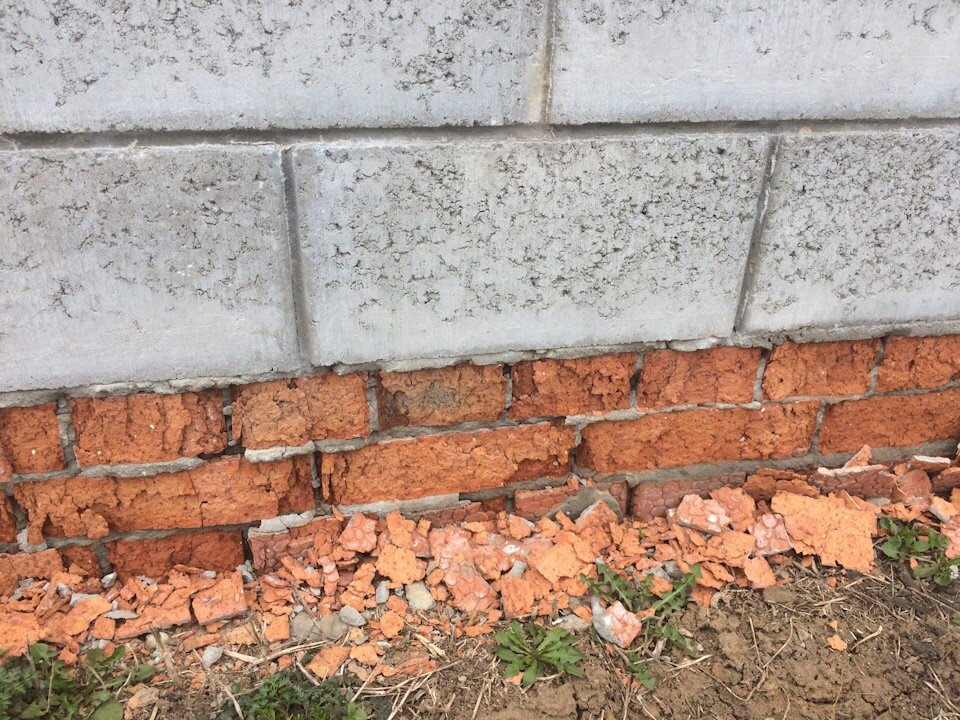 Если у вас на доме начал разрушаться цоколь, то чем скорее вы займетесь его ремонтом, тем меньше строительных материалов и соответственно затрат потребуется для его полного восстановления. Причина возникновения данной печальной картины, практически всегда одна. Кирпич впитывает влагу и разрушается. Перед началом работ по ремонту следует найти причину попадания воды. Например, на фотографии разрушение идет от отсутствия отмостки и наружной защиты кирпичного цоколя. Стена мокнет и разрушается. Наружняя штукатурка сделана была без учета намокания стен и поэтому разрушилась. Способы ремонта Самый простой вариант, разрушено менее половины кирпича. Необходимо произвести очистку стены от осыпающегося кирпича, при этом долбить стену не нужно. Очищенную стену следует обработать синтетической смолой (например, Полигардом). После нужно произвести утепление и выравнивание стены (пенополистиролом или другим утеплителем) и оштукатурить стену гидрофобным раствором. Таких гидрофобизаторов в продаже до