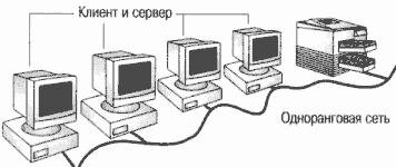 В одноранговых сетях каждый компьютер функционирует как клиент и как сервер. Для небольшой группы пользователей подобные сети легко обеспечивают разделение данных и периферийных устройств. Вместе с тем, поскольку администрирование в одноранговых сетях нецентрализированное, обеспечить развитую защиту данных трудно.