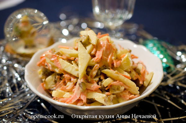 Чудесный зимний салат из “Книги о вкусной и здоровой пище”. Не смотря на свою простоту и незамысловатость обладает прекрасным вкусом, да и как иначе, ведь сочетание яблок, орехов и моркови не может быть проигрышным. Его, конечно, можно заправить сметаной, но с домашним майонезом по этой же книге, как написано в рецепте, получается очень вкусно! Здесь я приведу то кол-во продуктов, которое указано в Книге, но его получится много. Я уменьшала все в два раза и получилась миска объемом 350 мл., это примерно 2 порции. Ингредиенты: Яблоки очистить от кожуры, избавиться от семян и нарезать тонкими ломтиками. Морковь почистить и натереть на крупной терке или нарезать ее тонкой соломкой. Вот с этим пунктом у меня возникла проблема, которую я так и не решила: “Ядра грецких орехов ошпарить кипятком, снять оболочку и нарезать их некрупными кусочками”. Я и ошпаривала орехи и заливала кипятком, но оболочка не сдавалась. Так что в итоге плюнула на всю эту историю и просто измельчила орехи. Яблоки, мо