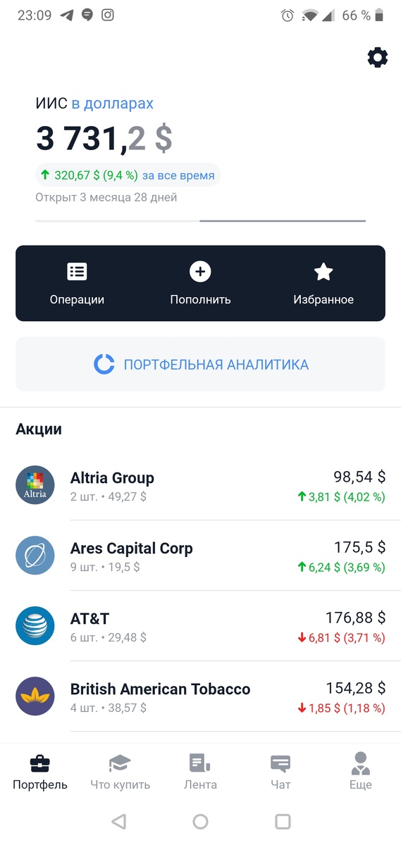 Доброй ночи! Спасибо, что читаете мои сообщения. Дорогу осилит идущий. Я в пути.... Вы со мной, или предпочитаете созерцать со стороны? С отчетом о предыдущей неделе можно ознакомится тут. Как писал ранее, начал приобретать акции на брокерский счет. На ИИС: 24.05.2021 приобрел 3 акции Lumen 24.05.2021 пришли дивиденды по British American Tobacco На брокерский счет: 24.05.2021 5 акций Ares 27.05.2021 5 акций Ares ИИС: Брокерский счет: Планы на следующие 13 дней. Буду наращивать портфель. Претенденты: PPL 08 июня US$ 0,415 на акцию, квартальная доходность 1,43% Williams 09 июня US$ 0,41 на акцию, квартальная доходность 1,59% Iron Mountain 13 июня US$ 0,6185 на акцию, квартальная доходность 1,44% Coca-Cola 13 июня US$ 0,42 на акцию, квартальная доходность 0,77% Ares 13 июня US$ 0,4 на акцию, квартальная доходность 2,1% Altria 13 июня US$ 0,86 на акцию, квартальная доходность 1,74% Желаю всем хороших выгодных, огромной прибыли, ЗДОРОВЬЯ и везения!
