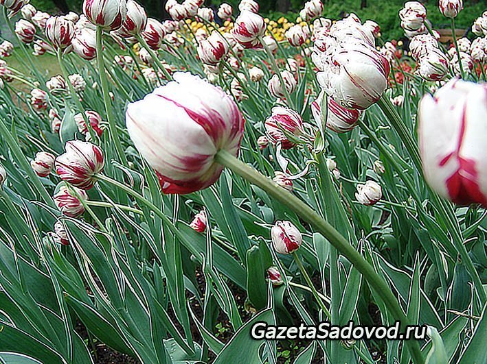 Основной бич тюльпанов - вирусное пестрение, при котором на лепестках появляются белые или желтые штрихи и полосы, иногда цветок почти обесцвечивается и из розового превращается в белый с розовыми штрихами. На темно-красных цветках может появиться черная штриховатость. Пораженные вирусом растения имеют более мелкие цветки, теряют свои сортовые признаки и могут стать источником заражения других растений. Поэтому запестревшие растения (а это можно обнаружить еще при бутонизации) следует немедленно убрать вместе с комом земли и уничтожить. Усиливается развитие болезни при несоблюдении агротехники, ранней или слишком поздней посадке. Снижается заболеваемость при выращивании из мелких луковиц, при заглубленной посадке и тщательной выбраковке запестревших растений.