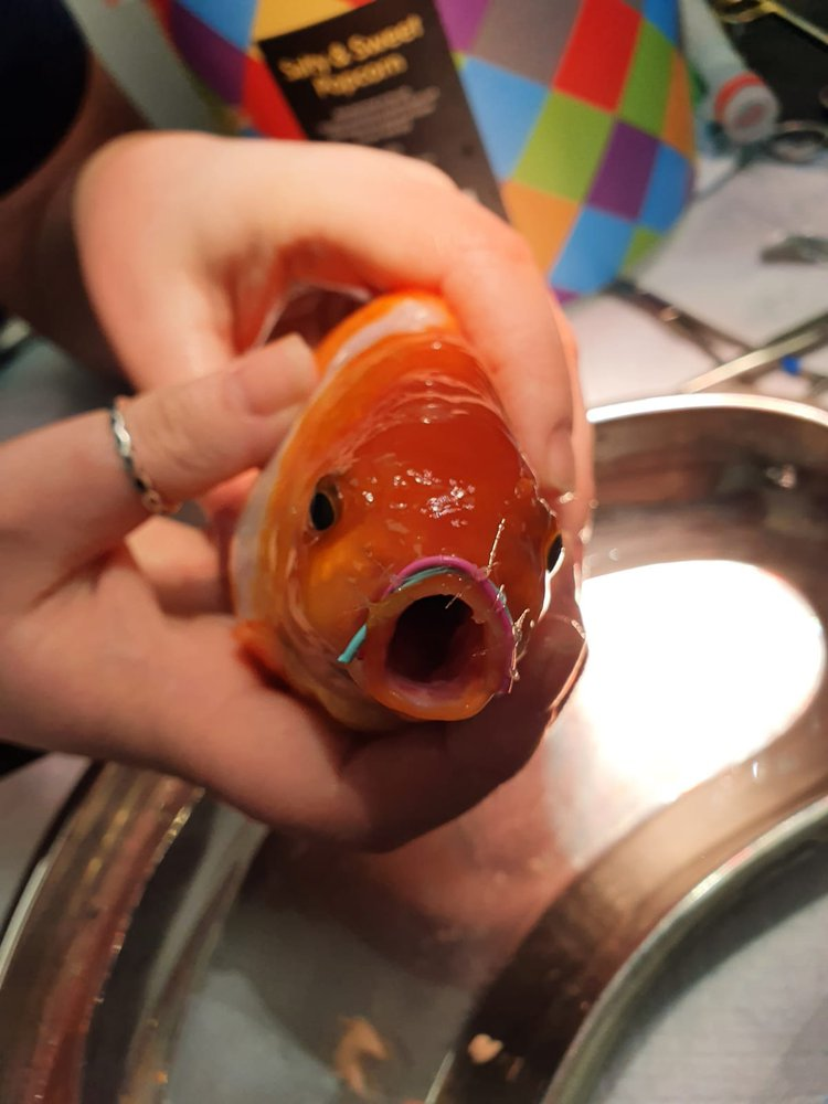 Несмотря на положение, сом не пострадал, а вот Стивен со сломанной челюстью отправился в клинику Vets4Pets Cramlington, где хозяйка сама сделала ему операцию. После анестезии Шона зашила ему горло и сделала фиксатор из пластиковых скрепок, пока челюсть не заживет. После восстановления скрепки были удалены, а Стивен вернулся к обычной жизни.