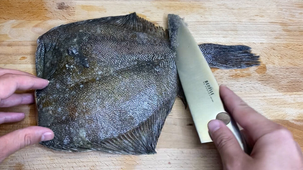 Буду краток - сегодня мы приготовим один из лучших рецептов на всем белом Дзене. В основе рецепта у нас камбала, которая, кстати, стоит совсем не дорого. Если брать камбалу среднего размера и без икры, то она выходит дешевле чем тот же минтай (который не понятно почему стал таким дорогим). Поэтому советую прям сейчас сломя голову бежать за камбалой, потом дочитаете! Камбала запеченная с овощами С камбалой возиться мы особо не будем. Камбала, она как Энекин Скайуокер, и у нее есть две стороны - темная и светлая. В отличие от Скайуокера, который окончательно принял темную сторону и стал Дарт Вейдером, камбала еще не определилась. Счищаем с камбалы темную сторону. Теперь обрубаем хвост и срезаем плавники. Можно запекать и с ними, но они занимают слишком много места, да и ходят легенды, что в плавниках содержится много гадостей. В итоге у нас получается вот такая лопата без черенка. Просушиваем камбалу и начинаем делать насечки. Насечки мы будем делать решеткой (наискосок друг от друга)