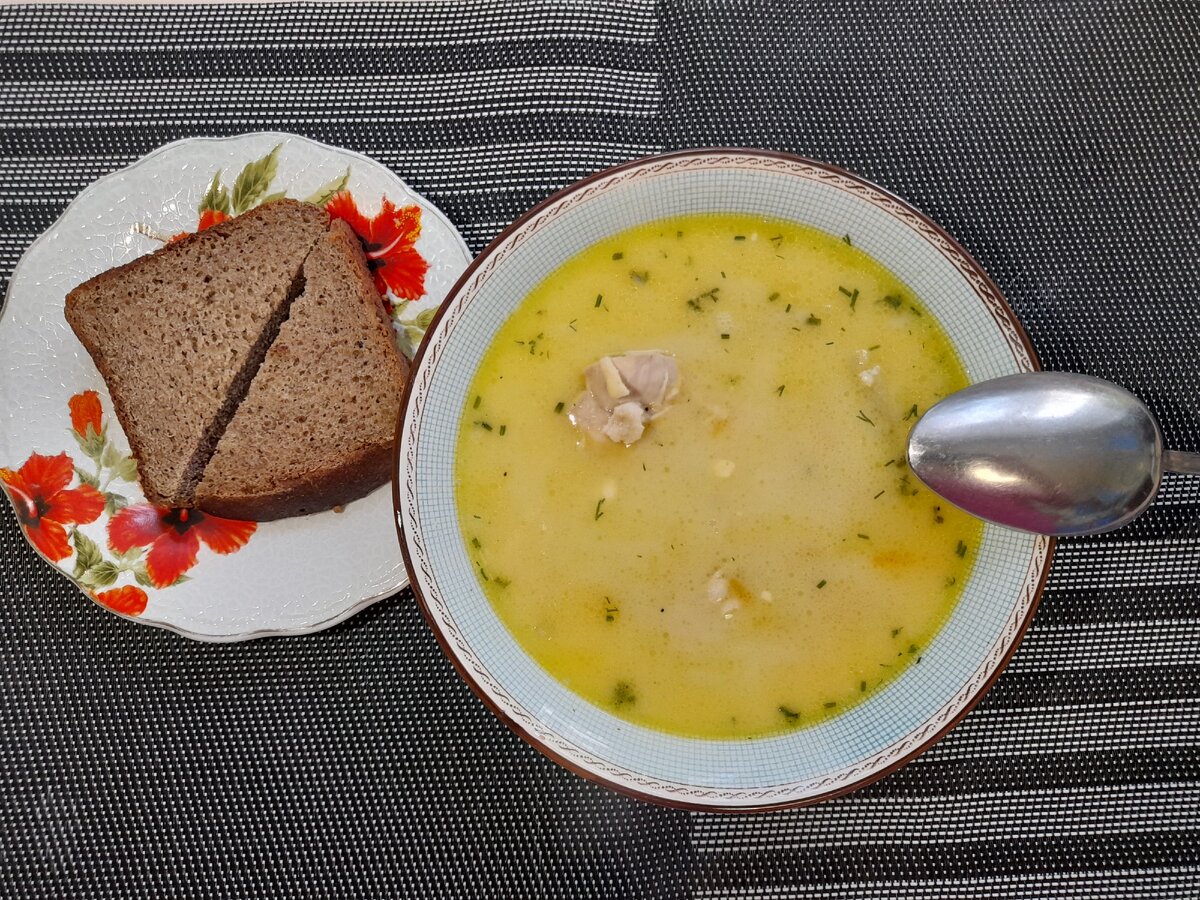 Привет, мои дорогие гости!!! Сегодня спешу поделиться с Вами необыкновенно простым рецептом сырного супа. Этот суп оценят все ваши домочадцы,готовится без особых хлопот и затрат, просто, быстро и очень-очень вкусным получается!!! Необходимо для приготовления супа: Мясо- 300-400 гр. любого ( у меня куриные крылышки) Картофель- 5-6 шт. Плавленный сырки-3 шт.( желательно с самой высокой жирностью) Морковь с луком пережарить на растительном масле. Зелень и лаврой лист ( у меня замороженный укроп) Приготовление : Кастрюля у меня объемом на 2 литра. В кипящую воду, запускаем наше мясо ,снимаем пенку. Крылышки я варю 15 минут. Затем запускаем картошку, варим еще минут 15 (пару картофелин я всегда запускаю целыми) ,а когда свариться ,достаю из супа и разминаю толкушкой, и кладу снова в суп для меня так вкуснее ,текстура супа получается,чуть гуще . Как картошка свариться запускаем нашу пережарку. Суп как закипит,запускаем на тертый сыр. Как сыр расплавиться, по времени у меня это бы