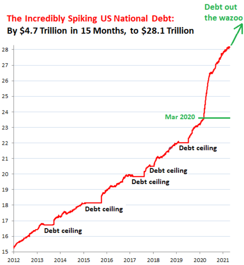 Государственный долг США создавался десятилетиями, а затем он еще больше увеличился, когда в 2018 году во время хороших времён (Good Times) вступило в силу снижение налогов. Но, начиная с марта 2020 года, он стал невероятно резко расти. С этого момента 15 месяцев назад он вырос на 4,7 триллиона долларов до 28,14 триллиона долларов, что составляет 128% ВВП в текущих долларах (первый график).