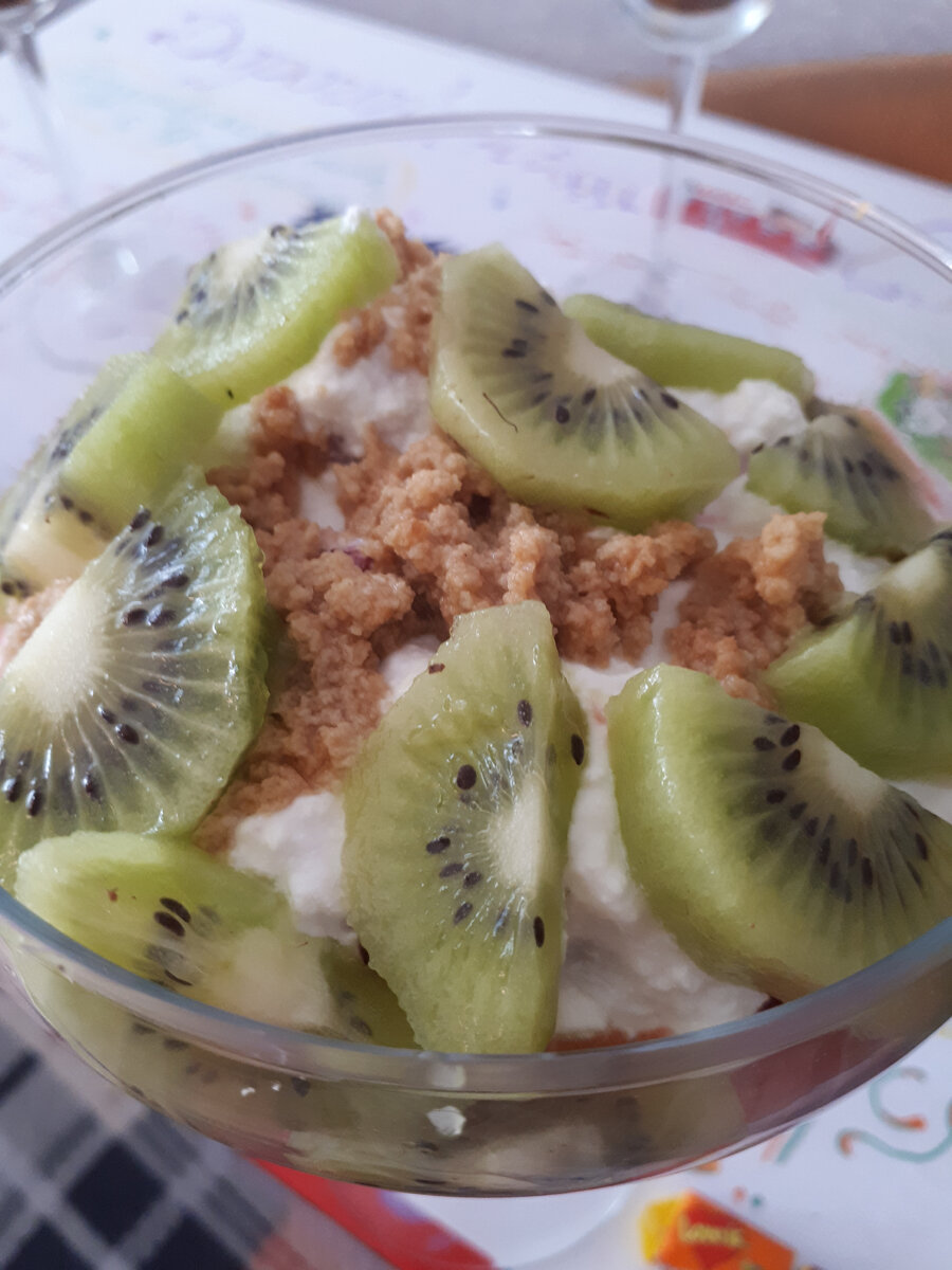 Моему старшему на днях исполнилось 18 лет))) Он у нас сладкоежка. Кроме тортика, решила, что не хватает ещё немного сластей) И приготовила десерт в бокалах, а ещё сладкий плакат - сюрприз - поздравляшку)) Про последнюю расскажу в конце, а сейчас про... 💥ТВОРОЖНЫЙ ДЕСЕРТ С ФРУКТАМИ И ПЕЧЕНЬЕМ💥 На 5 порций: 🍴500 гр творога 🍴50 - 70 гр сахарной пудры 🍴150 гр сметаны 🍴10 песочных печенек 🍴5 киви (почистить, порезать) 🍴клубника (я использовала замороженную) 🍴2 чашки кофе. Клубнику разморозить. Творог соединить со сметаной и пудрой. Лучше пробить блендером. В объёмном бокале выкладывать послойно: - печенье, смоченное в кофе - творожную массу - клубнику - снова немного творожного крема - чуть размоченной в кофе крошки печенья - кусочки киви. Дать пропитаться в холодильнике 3 - 5 часов. У нас этот десерт понравился всем. Теперь о плакате - поздравляшке. Тут всё тоже просто. Купили сладости и жевательную резинку, скомпоновали, приклеили и подписали))) Просто и мило)) А Вам бы понравила