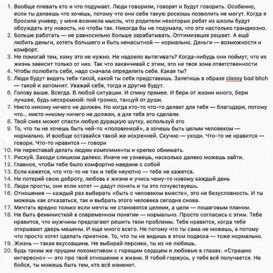 Мне 20 хотела я в честь этого прыгнуть с парашютом, но в связи с ограничениями по короне, мне не разрешили. однако обещали, что позвонят сразу как только можно будет. поэтому ,думаю, где-нибудь к лету вы увидите видосик как я с щенячьим восторгом прыгаю с парашютом ладно, я тут решила написать 20 вещей, которые поняла за свою жизнь. Дарья Андреевна, это для вас, не забывайте: