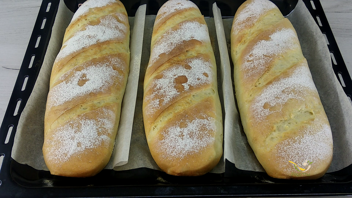 Хочу поделиться с вами рецептом таких вот замечательных и вкусных батонов. С этой порции получится три хрустящих и румяных батона, сделанных своими руками. Рецепт : Мука - 500-550 гр. Вода тёплая - 340 мл. Масло оливковое - 50 мл. Сухие дрожжи - 10 гр. Соль - 1ч.л. Выпекать при 200° 20-25 минут В большую миску просеять муку. Добавить воду, оливковое масло, сухие дрожжи и соль. Перемешать. Мешать сначала ложкой, потом начать замешивать тесто руками. Закрыть тесто пленкой и поставить в теплое место на 40 минут, чтобы оно увеличилось как минимум вдвое. Разделить тесто на три приблизительно равные части. Раскатать каждый кусок, толщина которого не более 0,5 сантиметра. Аккуратно свернуть его в рулет. Края рулета защипать. С тестом нужно работать на слегка смазанной растительным маслом поверхности. Руки также должны быть промаслены. Положить на противень швом вниз. Слегка придавить. Поставить подходить в теплом месте. Батоны должны увеличиться как минимум вдвое. Сделать острым ножом разрез
