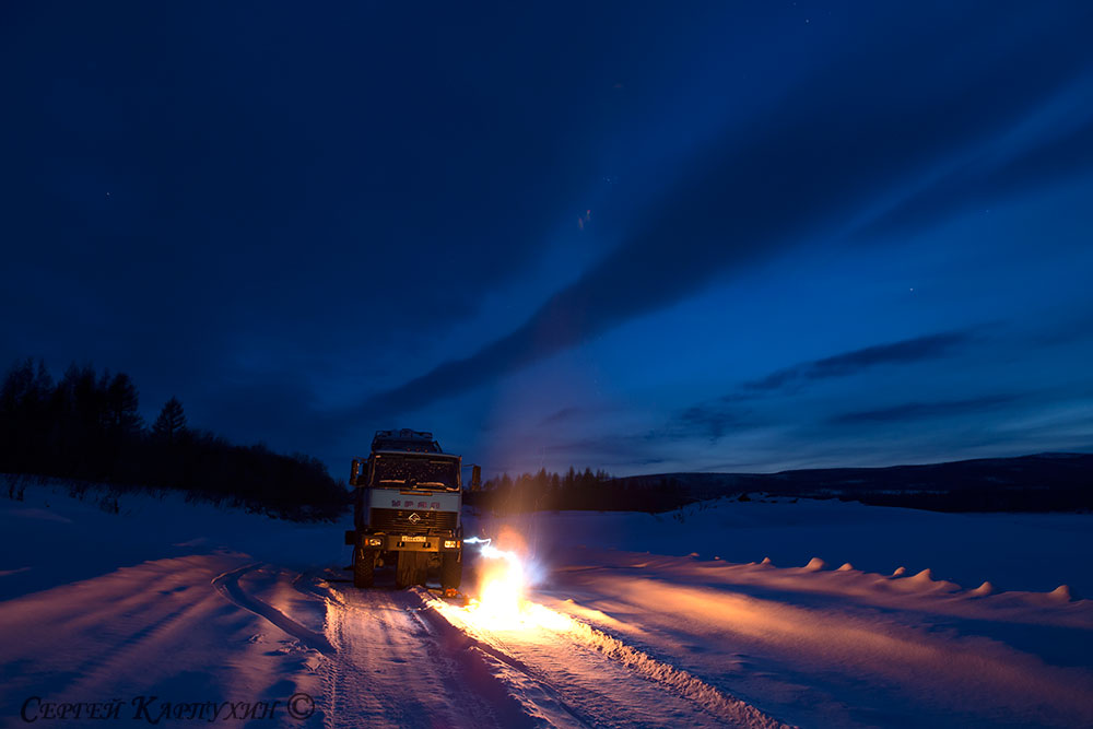 То, что у нас не всё в порядке, можно было догадаться по ещё дымящемуся костру перед кабиной автомобиля, в которой не горело ни одной лампочки. Мотор нашего «Урала» перестал функционировать ещё вчера в середине дня, все попытки как-то разобраться в причинах такой ситуации так и не привели ни к чему. Ясно стало только лишь одно, почему-то топливо очень плохо поступает. Наступила ночь и нам пришлось отложить все дела до утра. Конец марта уже весна, но это якутская весна и за бортом минус тридцать, в кабине умершего автомобиля лишь чуть теплее. К нашему счастью, в грузе, который везём, оказалось два тёплых спальных мешка, в них и коротали эту ночь.