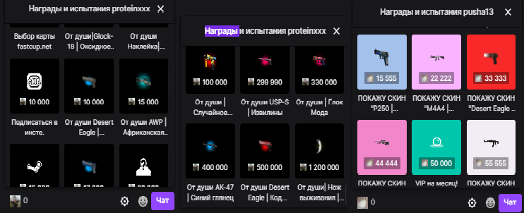 Скины из CS:GO за баллы TWITCH, или как стримеры накручивают живых людей привлекая их быть активным в чате и сидеть постоянно на стримах. Изначально можно было сказать, что это легальная накрутка для начинающих стримеров и выгода для всех: зрителям - скины, стримерам - онлайн. Но после того, как появилось много стримеров с магазином за баллы, TWITCH выкатил правило на то, чтобы за баллы нечего нельзя было купить помимо внутриплатформенных штук. Сейчас площадка не банит почему то стримеров с магазинами скинов, поэтому до сих пор есть подобные магазины НУ А САМЫЙ ЛУЧШИЙ МАГАЗИН( ЗДЕСЬ МОГЛА БЫ БЫТЬ ВАША РЕКЛАМА) (снизу прикреплены скриншоты подобных магазинов)