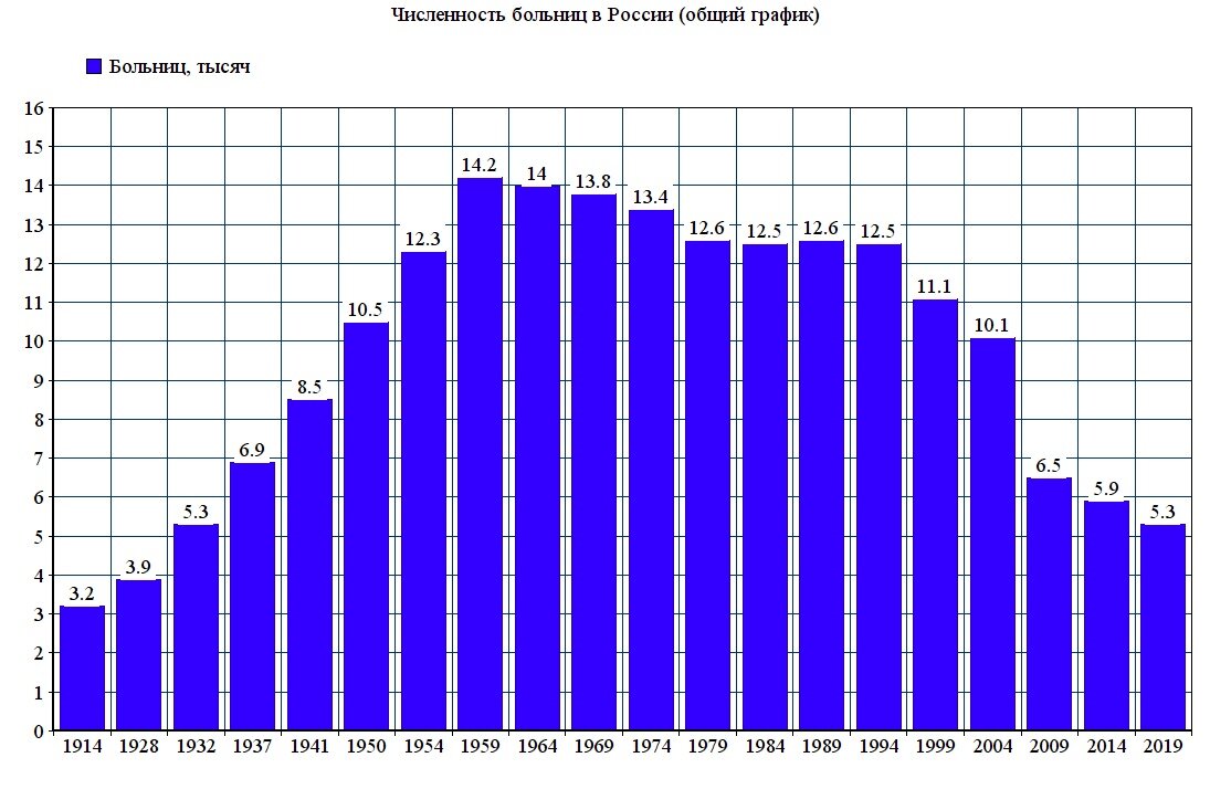 1. Жуткий, на первый взгляд, график снижения числа больниц в современной России. Их уже в 2,5 раза меньше, чем на момент краха советской власти (5300 против 12500). Если сокращение продолжится нынешними темпами, лет через 20 мы вернёмся в царские времена:
