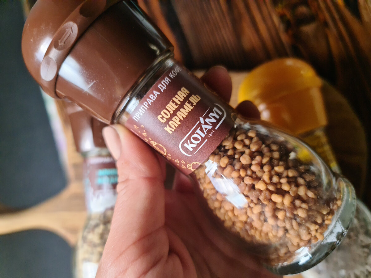 Мы часто покупаем мельнички со специями, особенно нравятся "Итальянские травы" и "Чеснок - соль". Ими мы салаты заправляем обычно, овощи вареные для гарнира посыпаем перед подачей. Фирма не важна, мы мельнички эти потом разбираем и наполняем сами, чтобы не покупать постоянно. А тут увидели новые мельнички, необычные, решили взять на пробу. Задуманы они, как приправы для кофе, а кофе мы любим))) Первым делом обратили внимание на соленую карамель: Состав нормальный, без сюрпризов и лишних ароматизаторов: - сахар - сироп глюкозы - соль йодированная - карамельный сироп На соленую карамель были большие надежды, но они не оправдались. В кофе надо положить очень много, чтобы едва был ощутим вкус. Но в итоге, чуть позже, мы нашли применение и этой мельничке. Но об этом позже, а пока - расскажу про остальные вкусы, которые были в наличии: "Манящий кардамон" и "Корица-сахар": Больше всего из этой линейки понравился именно кардамон. У него самый яркий вкус, хотя состав, надо сказать, мог бы быть