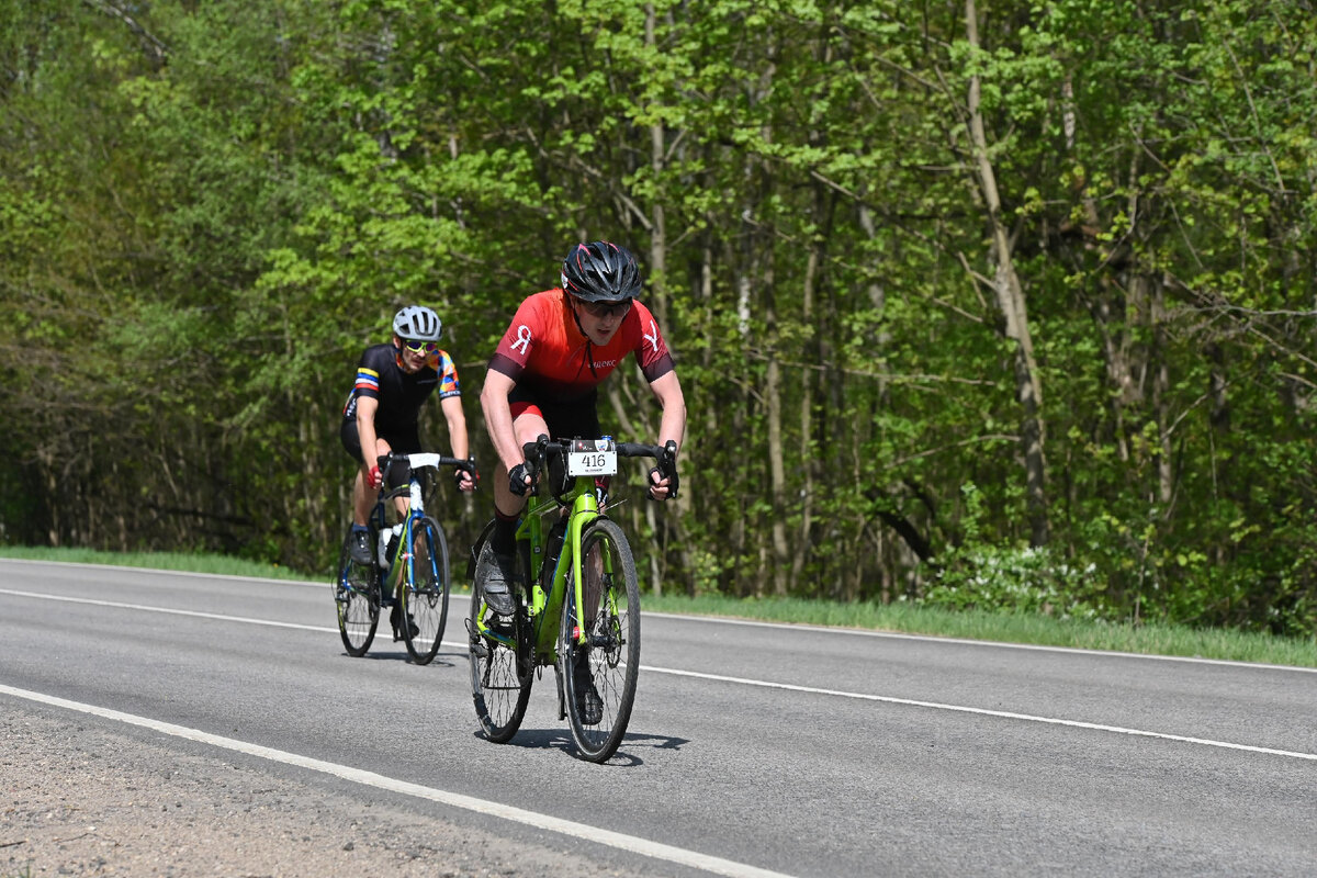 Разворот и последняя треть дистанции. Снова выкатываюсь вперед, а один из быстрых парней останавливается взять воды. Есть время передохнуть - но скоро они меня вновь обгоняют. Что ж, следует признать, они не только накатом гнать могут. Нас осталось четверо. Во встречном потоке вроде знакомые велы, с которыми ехали где-то раньше - сколько-то минут у них отыграли. На очередном спуске-подъеме с трудом хватает сил догнать впереди едущих - и сразу новый спуск-подъем, на этот раз приходится отпустить. Смотрю назад - никого. Ладно, едим второй гель, едем неторопливо и ждем попутного поезда. Главное, чтобы хватило сил в нужный момент разогнаться и заскочить в него.