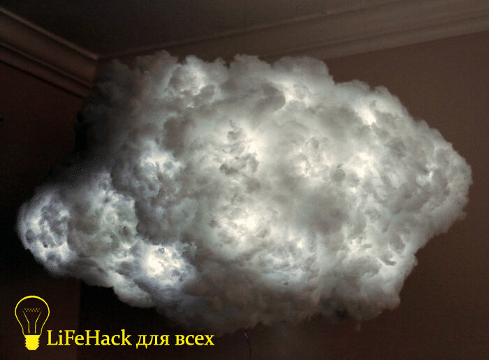 Делаем облака из ваты. Есть вещи, которые расслабляют и вдохновляют. Облакам это удаётся всегда! Но иногда вы не можете выйти на улицу и посмотреть на них. Сделайте висящее облако, чтобы наслаждаться видом неба в любое время, когда вы застряли в помещении. А дети будут в полном восторге! Эти облачные огни выглядят как настоящие. Кроме того, их так легко собрать. Все материалы, которые вам понадобятся, доступны по цене, не говоря уже о том, что их можно купить в местном магазине товаров для рукоделия или хозяйственном магазине. Итак, вот материалы, которые вам понадобятся: Вы также можете добавить несколько светодиодных гирлянд для создания эффекта шторма. Обратите внимание, что в этом проекте самым важным материалом является вата. Нужно как следует разрыхлить её, это придаст вашей лампе облачный вид, поэтому не забывайте об этом! Для начала прикрепите крючки для винтов к шарикам из пенопласта. Таким образом, вы сможете повесить готовое изделие к потолку. Затем прикрепите