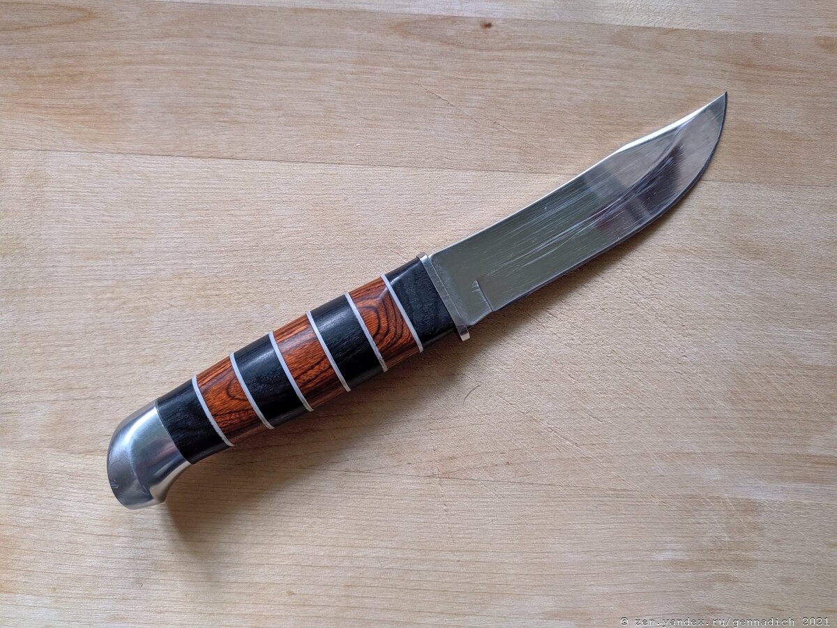 На рынках провинциальных городов в базарные дни раскладывают свой нехитрый товар современные коробейники. Импровизированные прилавки-развалы заполнены всяким ширпотребом. Крышки для банок, закатки, фумигаторы, средства от блох и клещей, дешевые кастрюли, сковородки и конечно же разные ножи. От недорогих кухонных, до вполне себе приличных на вид, с закосом под охотничьи или "зековские". Китай производит товар на любой вкус и кошелек. Решил по случаю прикупить один из таких "развальных" ножей и попробовать как он в деле. Вот он на фото. Изготовлен дядюшкой Ляо по мотивам ножей из пенитенциарных учреждений СССР. Длина ножа составляет 215 мм. На клинок приходится 110 мм. На ручку 105 мм. Клинок достаточно толстый. 3 мм в обухе. Ширина клинка 25 мм. На клинке видим клеймо завода изготовителя. Надпись BODA. И большой палец вверх. Типа мы лучшие. По сведениям из всемирной паутины, клинок изготовлен из стали 420. Ручка наборная из полимерных колец с текстурой под дерево и текстолит. Монтаж