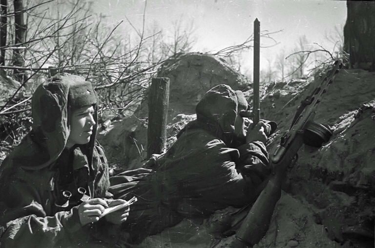 The commander of the Soviet scouts platoon, junior lieutenant P. Burdovitsyn, and the observer, Vahir Saidov, monitor the enemy’s movement using the TR-4X trench periscope. South-Western Front.