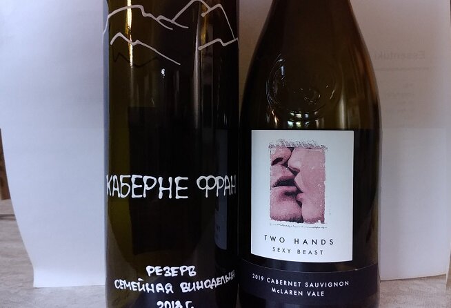 Ну и названьице у вина – Sexy Beast – «сексуальный зверь» в переводе! Выпускают австралийцы, винодельня Two Hands («две руки»). Этикетка не гармонирует с названием: на ней нежно целующиеся губы без намёка на звериную страсть. Выглядит это изображение исключительно привлекательно, и я всё ждал скидки, чтобы купить этого нежного зверя. И вот, в «щедрые выходные» в Metro цена на него опустилась к 2 тысячам при обычной больше трёх. Отлично, берём пробовать. Это каберне-совиньон урожая 2019 года и розливом начала 2020 года. То есть, вино было больше года в бутылке. У урожая 2018 года критика очень хорошая, до 92 баллов. Посмотрим, что тут. В сравнение выставляю свежее вино Константина Дзитоева, каберна-фран урожая 2018 года и датой розлива ноябрь 2020 года. Вино, очевидно, выдержанное. Опять некорректное сравнение, но обещаю в ближайшее время сравнить два чистых каберне-франа. Впрочем, тоже бедет некорректно, но не буду отвлекаться от сегодняшних героев. Вы посмотрите на самое интересное н
