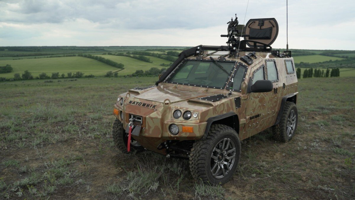 В России разработали бронированный компактный внедорожник для силовиков. Машину под довольно нелепым названием Nayomnik создала фирма ЮТЭК из Михайловска Ставропольского края. «Наемник» имеет безрамную конструкцию и несущий корпус, сваренный из листов бронестали. Силовая установка и шасси на 100% собраны из отечественных комплектующих. От какого именно автомобиля — не уточняется, но судя по рычагам передней подвески, которые видно на фото, «донором» послужила Лада Нива. Особенность конструкции — полноуправляемое шасси. Для повышения маневренности колеса передней и задней осей поворачиваются во взаимопротивоположных направлениях. «Бронеавтомобиль способен выдерживать попадания небольших снарядов (класс защиты 3, пулевая защита бронестекол — калибр 5,45мм и 7,62мм). В том числе бронирована и нижняя его часть со стороны дороги. Техника оснащена системами автоматического пожаротушения моторного и пассажирского отсеков. Следить за обстановкой снаружи машине позволяют видеокамеры, мониторы