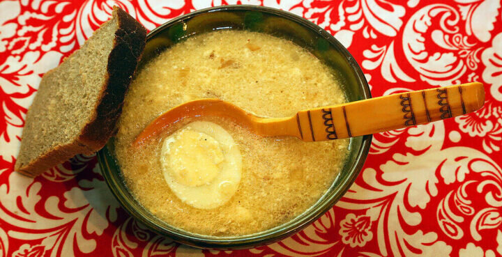 Здравствуйте, дорогие друзья! С вами Надежда! Суп польский Журек – традиционное блюдо польской и белорусской национальной кухни, которое было очень популярным в древние времена. Многие славянские народы готовили его в виде похлебки с овсяной мукой. Основой для приготовления этого супа служит закваска в виде жидкого раствора муки. По другому ее еще называют цежей. Что бы сделать закваску, необходимо взять ржаную или овсяную муку (150-200 г), развести водой (1 л), и дать настояться продолжительное время, затем процедить. Насыщенность вкуса Журека будет зависеть от времени выдержки закваски. Для лучшей активизации всех составляющих, необходимо периодически взбалтывать раствор, чтобы мука не оседала на дне. Готовая закваска может хранится в холодильнике до двух недель. В любом современном ресторане в Польше можно заказать классический Журек, представленный как национальное блюдо. Интересна также оригинальность его подачи - в виде «хлебной тарелки», которая выпекается в духовке. Для приверж