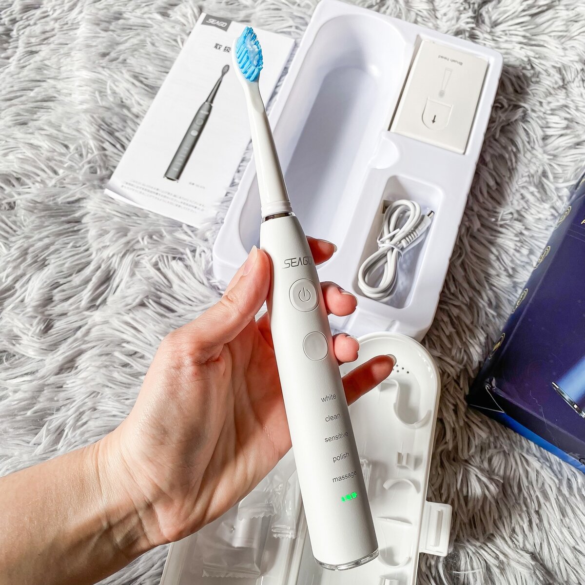 В магазине seago Official Store я приобрела не одну электрическую зубную щётку, а сразу 2, вторую взяла на подарок. Эта модель имеет несколько отличий от предыдущей: она немного больше, в ней не 4, а 5 режимов, установлен более мощный аккумулятор, прилагается насадка для чистки труднодоступных мест, есть подробная индикация режимов работы и заряда, 2 кнопки для управления. Доставка осуществлялась с Российского склада и длилась 5 дней. Щётка пришла в фирменной коробке с указанием названия бренда и характеристик. В комплекте также шла инструкция на английском языке, usb кабель для зарядки, сменные насадки, пластиковый чехол для хранения. Внимание: этот пост содержит рекламные ссылки (если их можно таковыми назвать). Вещь куплена мной на AliExpress, все фото мои, мнение о товаре тоже моё. Прямая ссылка на товар на AliExpress: https://s.click.aliexpress.com/e/_At3dmx По ссылке есть несколько комплектаций на выбор. Также можно выбрать цвет щётки: чёрный или белый. Корпус щётки полно