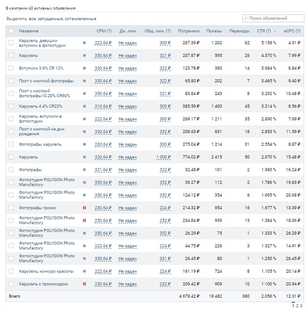 В этом кейсе мы вам расскажем как продвигать группу в вк, по бронировании ФОТОСТУДИЙ В «Санкт-Петербурге» Ссылка на группу/заказчика : vk.com/polygon_photo Выбор целевой аудитории Ниша достаточно востребованная, и целевой аудитории достаточно много, но мы выделим наиболее "активные" 2. Фотографы, Женская ца 25-35 лет; 3. Вступившие в модельные школы; 4. Фотографы по статусу; 5. Фотографы из тематических сообществ; 6. Именинники; 7. Пары. Целевую аудиторию мы распределили по мере их кликабельности, и вступления в сообщество. ! Важно при подборе Целевой аудитории: обращайте внимание на сочетание фотографий и людей, чтобы было все синхронно. Тестовая рекламная кампания Время проведения тестовой рекламной кампании: 12.09.18 – 21.09.18. Лимит на проведение теста: 5000р. Потрачено: 4678,42р. Стоимость обращения: неизвестна вследствие смешивания рекламного трафика с уже существующим. 2. Следующий формат промопостов, который показал себя хорошо – формат «Универсальная запись», CTR 3,684% 3. Т