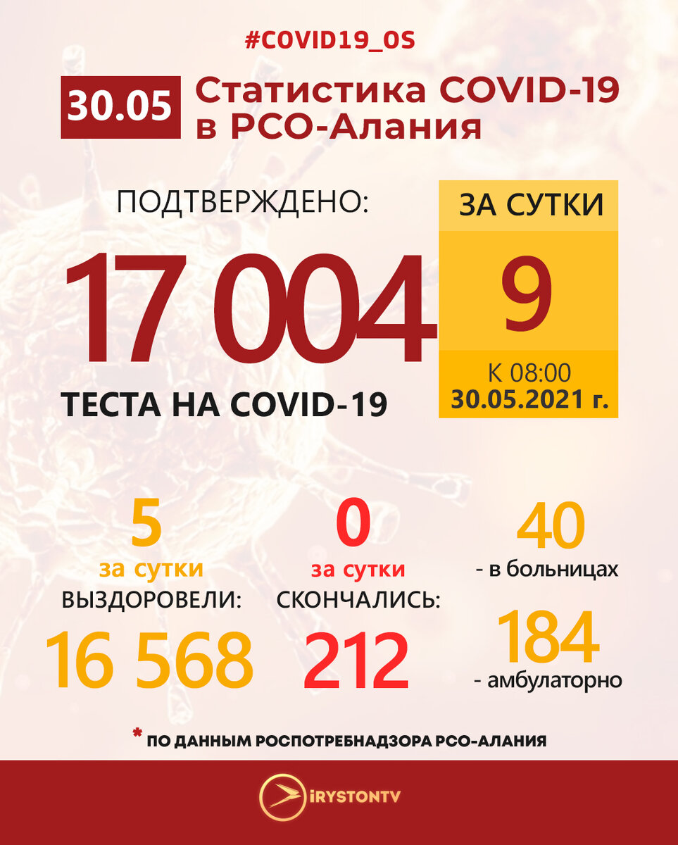 По данным Роспотребнадзора РСО-Алания на 08:00 30 мая 2021 года в Республике Северная Осетия-Алания зарегистрировано 17 004 (+9 за сутки) случая заражения новой коронавирусной инфекцией.