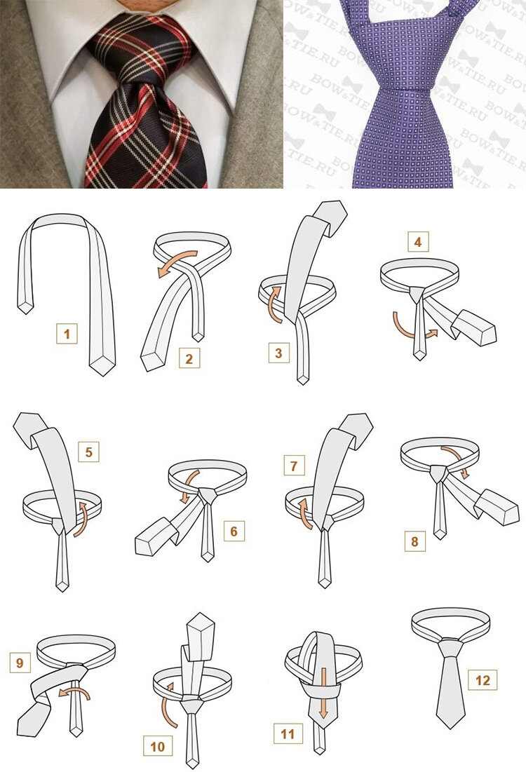 Может кому-то надо к завязать галстук - Накиньте галстук, чтобы широкий конец был справа, перекрестите концы. Проденьте широкий конец над сформированным воротником, оберните его раз и вытяните влево. Проденьте под узким концом слева направо. Потяните широкую часть к шее и проденьте под галстук. Вытяните широкий конец вправо. Переложите широкую часть справа налево, формируя узел. Широкий конец вновь проведите под воротничком галстука.