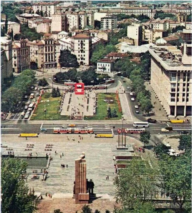 Площадь НЕЗАВИСИМОСТИ в Киеве. История торжества сатанистов. В фото. (часть 1) 1) фото. Площадь Калинина до реконструкции в семидесятые 2) фото - реставрация в виде добавления ШЕСТИ фонтанов (70-е годы) 3) фото - реставрация в виде добавления большого фонтана чаши (80-е годы) В 1970-е площадь реконструируют. В 1977 году здесь установили памятник в честь «60-летия Великой Октябрьской революции», а саму площадь опять переименовали — в Октябрьской революции. В финале добавили 9-метровую фигуру Ленина в 1980. Гостиница "Украина" раньше называлась "Москва", в момент её строительства (1957 год). Давайте дам своё понимание того, что было сделано. Началась перестройка СССР под культуру Антихриста. Однако начинали всё делать самыми скрытными образами. Для начала в 70-е годы запустили по всей стране огромное количество памятников "Великого Октября" и "Ленина". Т.е. идею отлили в камень, тем самым осуществив её закостенение. Можно сказать, что ей отрезали крылья, прибив цепями к камню. А далее на