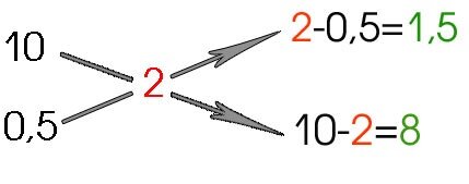 Например, карбонатная жесткость водопроводной воды - 10°kH, обессоленной с помощью системы обратного осмоса - 0,5°kH, требуется получить воду с карбонатной жесткостью - 2°kH. Записывают одно над другим значения kH водопроводной и осмосной воды, справа между ними - нужное значение kH. Далее крест-накрес