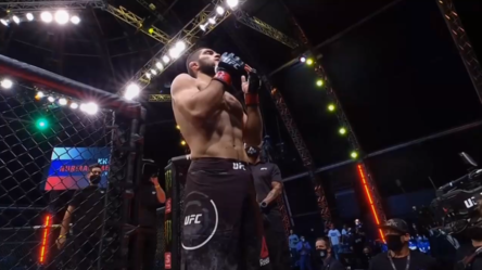 Хабиб Нурмагомедов победил Джастина Гейджи на UFC 254, защитил титул чемпиона в легком весе и получил бонус за лучшее выступление вечера. На это он потратил 6 минут 36 секунд. Первый раунд. Начало боя прошло в центре октагона на дистанции. Больше минуты Хабиб не наносил ударов, а Гейджи несколько раз отвечал лоу-киками и попадал по лицу. На третьей минуте Хабиб плотно пробил с колена. Раунд прошел в стойке. Первый тейкдаун Хабиб провел на пятой минуте. В конце первой пятиминутки он пытался провести болевой прием, но не закончил рычаг локтя правой руки из-за окончания раунда. В перерыве тренер Гейджи сказал ему продолжать давить лоу-киками: «Не ленись, и ты выбьешь из-под него переднюю ногу». Дополнительный смысл внес Дэйна Уайт, который после боя сказал: за три недели до этого Хабиб сломал ногу и лежал в больнице. Второй раунд. Первая минута прошла в стойке, и Гейджи бил болезненными лоу-киками. На второй минуте Хабиб пропустил один из них, но провел тейкдаун, закинул ноги на шею Гей