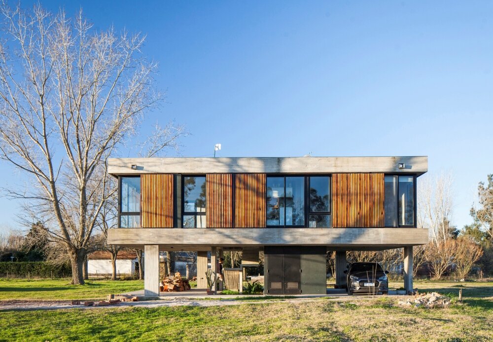 Двухэтажный жилой частный дом с очень необычной конструкцией расположен в аргентинской провинции, недалеко от Буэнос-Айреса. Его оригинальность заключается в том, что вход в дом осуществляется со второго этажа, а входная группа располагается фактически в центре застройки. Таким образом, крыльцо находится посередине дома, в атриуме с межэтажной лестницей.