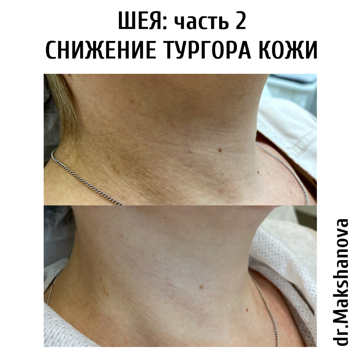 Физиологически кожа на шее сильно тоньше, чем на лице и практически лишена подкожно-жировой клетчатки. Как правило, первые возрастные изменения появляются к 32-35 годам. И, к сожалению, работать с шеей гораздо сложнее, чем с лицом. Поэтому не нужно ждать , когда признаки увядания кожи будут видны невооруженным глазом. Предлагаю Вам оценить тургор по щипковому или пинч тесту: захватите все слои кожи и ткани под ними, удерживайте одну секунду, затем отпустите. Обратите внимание, как быстро кожа вернется в исходное состояние: 1)немедленно; 2)менее 2х секунд или 3) более 2х секунд. Если Ваш вариант ответа второй или третий, то уже пора проводить косметологические процедуры по улучшению качества кожи шеи. В зависимости от выраженности возрастных изменений я предпочитаю следующие методы в области шеи: - Коллагеностимуляторы: Радиесс, Скульптра, Эстефил, Эллансе. (см видео). Они отлично уплотняют кожу, рекомендую их использовать 1 раз в 3-6 месяцев. К сожалению, классическая гиалуронов