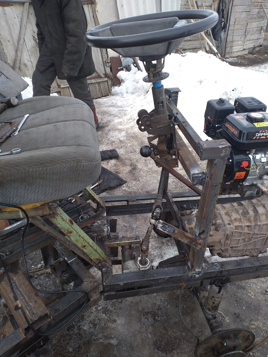 Доброго времени суток. Сегодня в этой статье я расскажу про руль для минитрактора и ручку КПП. Руль для минитрактора мы взяли на авторазборе от 08 семейства автомобилей с регулировкой по высоте. Цена 800руб. для установки понадобился еще рулевой кардан от классики так как большой угол между рулевой колонкой и рулем. Для руля сварили раму. Руль установили сразу по высоте и удобству и закрепили. На рулевой колонке срезали длинный вал и ближе к самой колонке приварили ее же шлицы чтобы вал стал короче. Из-за большого угла пришлось ставить 3 кардана и сделать опору для вала чтобы его не выламывало. Регулировка при этом отлично работает. Трактор поворачивает очень легко даже без колес. С ручкой КПП все намного проще. Выставили первую передачу надпилили рычаг болгаркой и согнули влево и вверх, но так чтобы немного не касался рамы иначе будет дребезжать, потом заварили. Рычаг сделан из шестигранника с резьбой просто где то нашли и на него хорошо навернулась ручка от родного рычага классики.