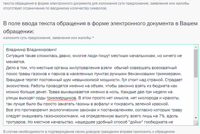 Владимир Владимирович! Ситуация такая сложилась давно, многие люди пишут местным начальникам, но ничего не меняется. Дело в том, что местные органы жилуправления взяли обычай совершать всеохватный покос травы газонов и парков в населенных пунктах ручными бензиновыми триммерами. Граждане терпят постоянный шум невыносимой мощности. Гул стоит над страной. Страдает экосистема. Работы проводятся именно на объем, чтобы законно взять из бюджета как можно больше денег. Трава выкашивается именно в ноль. Каждые две-три недели на улицы выходят орды триммерщиков. В этом просто нет смысла, нет кислорода и красоты, так лучше было бы просто закатать газоны в асфальт и покрасить зеленой краской. Все это противоречит экологическим законам и постановлениям, согласно которым траву следует окашивать газонокосилками, на определенную высоту, всего лишь на 7%, вдоль тротуаров. Но местное начальство, нашедшее удобный способ "дойки" госбюджета не обращает на нормы САНПИН никакого внимания Из этих "мелочей", вероятно не видимых правителями РФ на фоне глобальной политики состоит жизнь наших граждан. Положение серьезное. Как будто людей невротизируют специально. Что касается предыдущего моего обращения к вам, Владимир Владимирович, то дело обстоит так. В письме было указано, что в бесплатном пакете ЭФИРНОГО ВЕЩАНИЯ ТВ, всего 45 каналов, нет ни одного канала о науке. Есть два канала о православии, которые скорее подрывают рейтинг церкви, несколько - с мультфильмами, музыкой, фильмами крайне низкого качества, юмор, но вот о науке - ни слова. Канал "Культура" - это постоянная трансляция игры на пианино. Науки у нас нет. Была просьба дать в бесплатный телеэфир хотя бы один канал наподобие "Дискавери" или "Виассат хистори". При этом все остальное вообще можно было бы убрать. Мое письмо вы не прочитали, его сразу отправили в заведение, называющееся несколько странно "Министерство Цифры". Это то самое заведение, которое собственно и организовало данный порядок вещей. И там мне ответил некий Трубицын. Он перечислил научные каналы, существующие в ИНТЕРНЕТЕ и на этом общение закончил. Хорошо бы, если бы ваши чиновники хоть немного вникали в смысл сообщений граждан. На этом я завершаю свое обращение. Всего хорошего