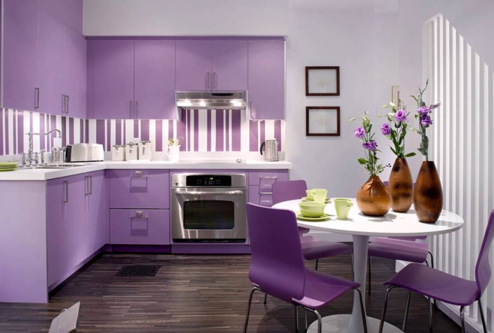 Всем известно, что в интерьер красиво и четко вписать фиолетовый оттенок очень сложно. А как работать с сиреневым цветом, который является близким родственником фиолетового? Здесь все проще, поскольку он не настолько темный. Но следует помнить об особенностях оттенка, если вы хотите обновить кухню и ее дизайн. Общая характеристика цвета Если вы используете сиреневый цвет для создания интерьера кухни, то должны знать его свойства: 5 секретов по применению в интерьере кухни 1. Можно взять данный оттенок для оформления некоторых деталей, чтобы акцентировать на них внимание. Подобный цвет не слишком часто можно увидеть в природной среде, дома следует соблюдать идентичный принцип. Если всю кухню выполнить в таком цвете, то такой вариант может понравиться далеко не всем. А вот кухня, созданная в более сдержанных тонах, но с сиреневыми акцентами будет отличаться свежестью, уютом, универсальностью. Акцентировать внимание с помощью сиреневого оттенка можно на посуде, стульях, светильнике, штора