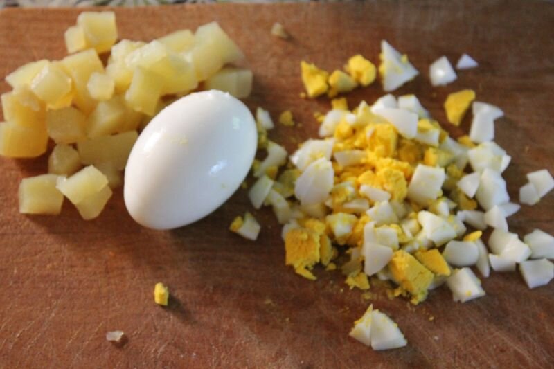 Картошку режем мелко, яйца крупно, огурцы: половину количества режем мелкими кубиками, вторую половину трем на терке.