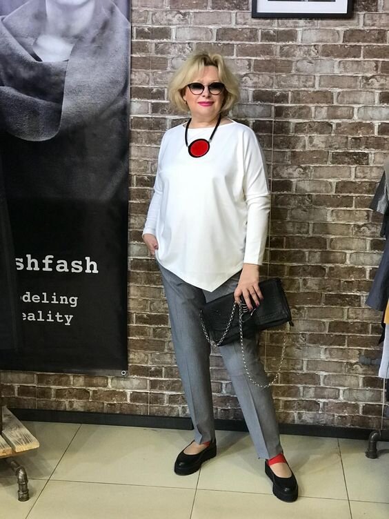 - Стиль образу придают детали. Комплект из серых брюк и белого джемпера будет выглядеть намного интереснее, если нижний край джемпера будет асимметричным. Украсят образ и интересные детали – оригинальная бижутерия и туфли на толстой подошве с эластичной перемычкой красного цвета на подъеме ноги.