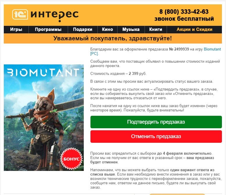 Активность началась в начале года, 01 февраля предзаказавшим Biomutant покупателям пришло письмо от 1С, с информацией об изменении цены стандартного издания с 1499р. на 2399р.