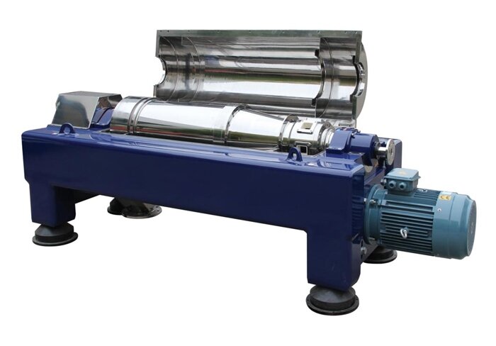 Промышленные центрифуги осадительно-фильтрующего типа или декантеры применяются для разделения суспензий на фазы в технологических процессах, не требующих промывки осадка и получения продукта с низкой остаточной влажностью. Оборудование с горизонтальным ротором, высокой степенью автоматизации, шнековой выгрузкой осадка характеризуется надежностью в эксплуатации, простотой в техобслуживании, широкой сферой решения задач сепарации. Принцип работы Суспензия поступает в горизонтальный цилиндрический барабан. Загрузка производится через специальную трубу, ведущую далее в полый шнековый вал. Барабан вращается, постепенно увеличивает скорость, благодаря чему продукт равномерно распределяется по внутренней поверхности. Под действием центробежной силы твердые частицы оседают на стенках барабана. Шнек вращается медленнее. За счет разности скоростей осадок с помощью системы ножей и скребков перемешается по направлению к конической части барабана, достигает разгрузочной камеры и выгружается. Жидка