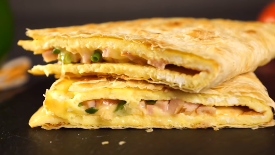 Начнём. Рецепт №1-Омлет в лаваше с сыром и ветчиной Для него нам понадобится: ● Яйца - 3-4 шт. ● Соль - щепотка ● Тонкий лаваш - 1 шт. ● Сыр - 30 г ● Ветчина - 30 г ● Лук - 1-2 пера Разбиваем яйца в тарелку подсаливаем и перемешиваем, затем выливаем на сковороду и сверку кладем лист лаваша. Переворачиваем, для удобства можно накрыть тарелкой. На одну сторону. насыпаем сыр, сверку, колбасу и лук, закрываем и обжариваем с двух сторон под крышкой по 30 секунд. Рецепт №2- Хот-дог в хлебе Для него нам понадобится: ● Хлеб тостерный ● Сыр плавленный тостерный ● Горчица американская ● Сосиска ● Яйцо Начнём. Для начала скалкой раскатываем один кусок хлеба, намазываем его горчицей сверху кладём сыр. Берём сосиску, обворачиваем её и отправляем на противень. Затем кисточкой покрываем яйцом с двух сторон и отправляем в духовку на 10 минут при температуре 180 градусов. Рецепт №3- Двухслойный омлет с сыром Для него нам нужно: ● Яйца - 4 шт. ● Укроп ● Соль ● Перец ● Сыр Сначала отделяем