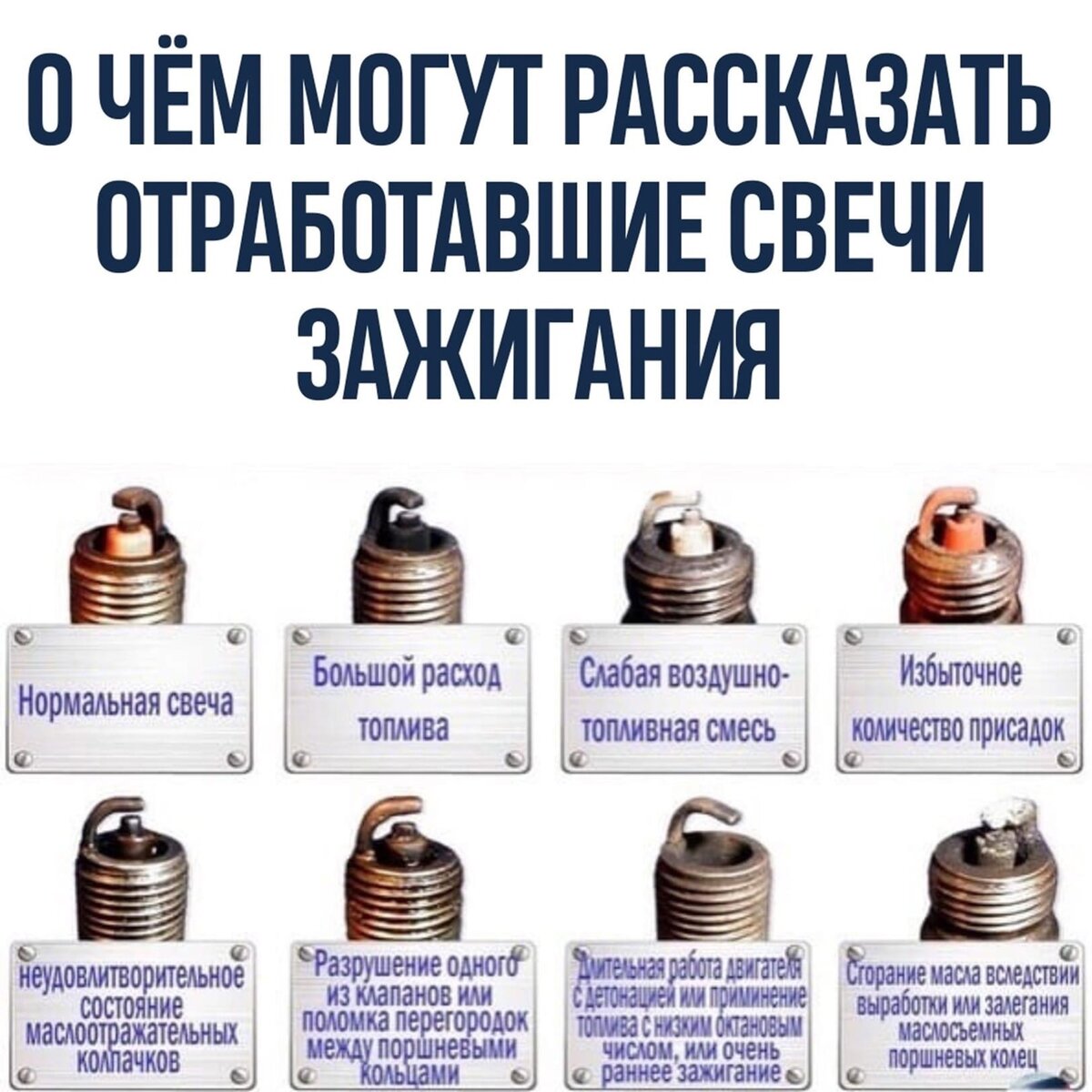что могут рассказать свечи зажигания об автомобиле! Обычная, нормальная не запоганенная свеча не о чем не расскажет. Тёмная подгоревшая свеча расскажет о том, что у автомобиля большой расход топлива. Чу-чуть подгоревшая свеча с белым наконечником означает, что с бензином проблема и надо заправлятся на другой АЗС. свеча с красным наконечником, это обозначает о большом количестве присадок. Тёмная свеча с тёмным наконечником расскажет о неудвлетворительном состоянии маслоотражательных колпачков. Тёмная, грязная свеча это признак того, что разрушился один из клапанов двигателя или сломались перегородки между поршневыми кольцами. Тёмная свеча без наконечника это плохой знак, так как он может означать, длительную работу двигателя с детонацией, или применение топлива с низким октановым числом, либо очень раннее зажигание. Свеча со сломанной шпилькой над наконечником означает сгорание масла вследствии выработки или залегания маслосъёмных поршневых колец.