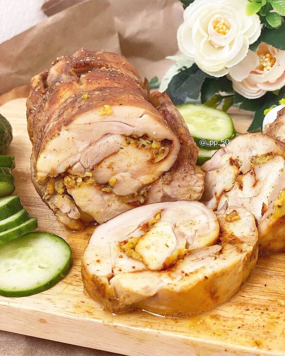 📊КБЖУ на 100 гр: 216.5/23.8/12.3/2.5 Лучше всякой магазинной колбасы и ветчины😉 Если очень хочется вкусный бутерброд, да ещё чтобы без всяких вредностей в составе, этот рецепт точно для вас. Очень легкий в приготовлении рулет из куриных бедрышек. ⠀ Ингредиенты: 🍗Куриные бёдра без кожи 1 кг 🧄Чеснок 20 гр 🥄Горчица 10 гр 🥣Гранатовый соус 20 гр 🍶Табаско пару капель/по желанию 🧂Соль/перец/специи ⠀ Рецепт: 1. На фольгу выложить филе внахлест 2. Посыпать специями и рубленным чесноком 3. Свернуть в рулет, запечь 4. Смазать соусом, снова запечь Готовьте с удовольствием, приятного аппетита😋 ________________________ •РЕКОМЕНДАЦИЯ❗️ПЕРЕД ЗАПЕКАНИЕМ( если позволяет время) уберите мясную заготовку ( в фольге) в холодильник минимум на 3 часа, чтобы рулет успел пропитаться специями. •ВАЖНО❗️ПОСЛЕ ЗАПЕКАНИЯ-обязательно уберите рулет в холодильник минимум на 2 часа - если нарезать 🔪 сразу, он может развалиться
