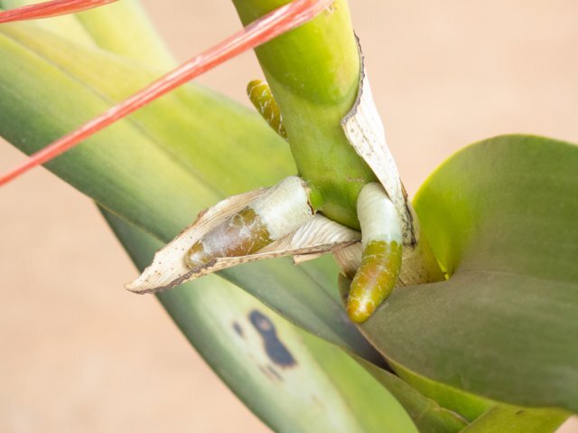 Если растение успело "отдохнуть" раньше указанного срока, оно даст вам об этом знать появлением новых воздушных корней с насыщенно зелеными кончиками: в этом случае пора возобновлять уход. Кстати, одновременно с корнями могут начать расти и новые цветоносы: они отличаются от корней равномерной окраской и неровным кончиком, на котором с самого начала видно зарождение почки.