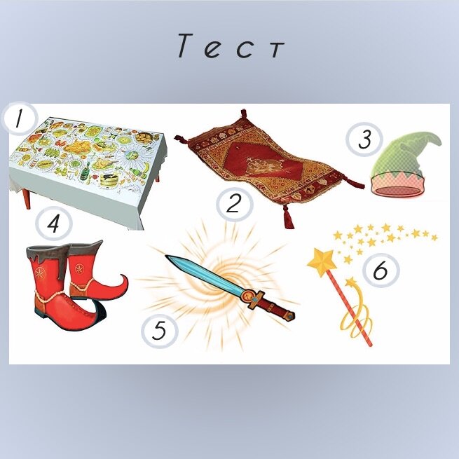 «Сказка – ложь, да в ней – намёк». Действительно: анализируя сказки, можно узнать много интересного и полезного из области психологии. Каждому из нас в детстве хотелось иметь какой-нибудь волшебный сказочный предмет. Оказывается, выбор этого предмета имеет психологические корни и позволяет узнать основные ценности человека и причины возникающих проблем. Посмотрите на предложенные предметы. Каким из них Вы хотели бы обладать? Результаты: 1. Скатерть-самобранка Больше всего Вы цените дружеские отношения и общение со своими друзьями. Вы – преданный и надёжный друг, всегда протянете руку помощи и поспешите на выручку, не жалея ни сил, ни времени, ни средств. У Вас есть проверенные временем друзья, с которыми Вы прошли много испытаний. Вы терпимы к их недостаткам, всегда поймёте и оправдаете любой их поступок. Для Вас важно, чтобы близкие люди были успешны, поэтому Вы всячески помогаете им двигаться вперёд, порой забывая о собственных планах и амбициях. Но Ваши ресурсы не бесконечны, поэтом
