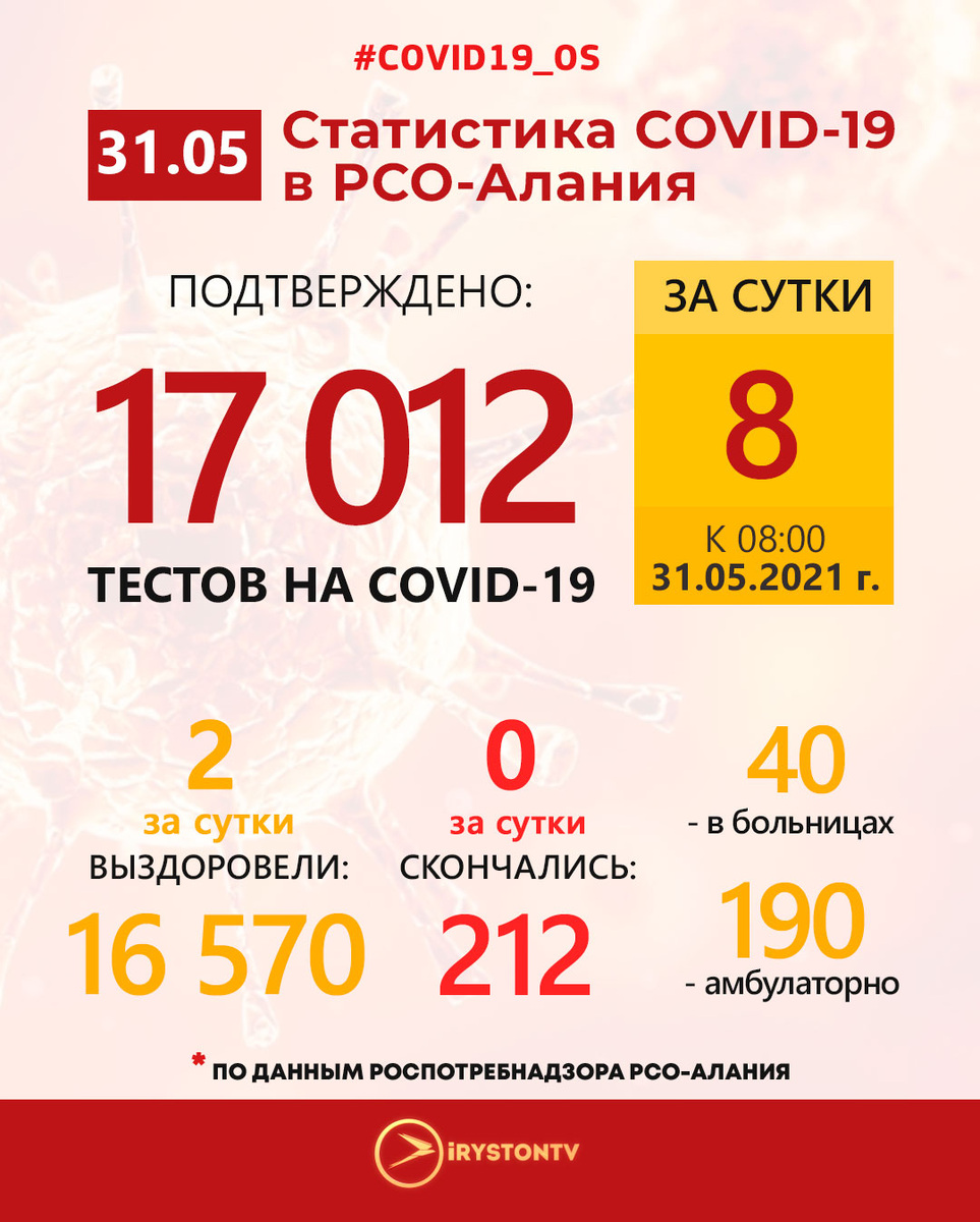 По данным Роспотребнадзора РСО-Алания на 08:00 31 мая 2021 года в Республике Северная Осетия-Алания зарегистрировано 17 012 (+8 за сутки) случая заражения новой коронавирусной инфекцией.